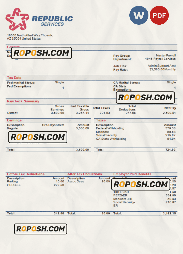 Grab now fully editable USA Republic Services waste management company pay stub Template from our website roposh and put your own info to create a copy of USA Republic Services waste management company pay stub template Word and ready your own novelty documents. It’ll be so beneficial if your pay stub is expired, stolen or not available. We also have word invoice template, ID Card psd template, Bank Statement psd template, drivers license psd template, Utility bill psd template & pay stub.