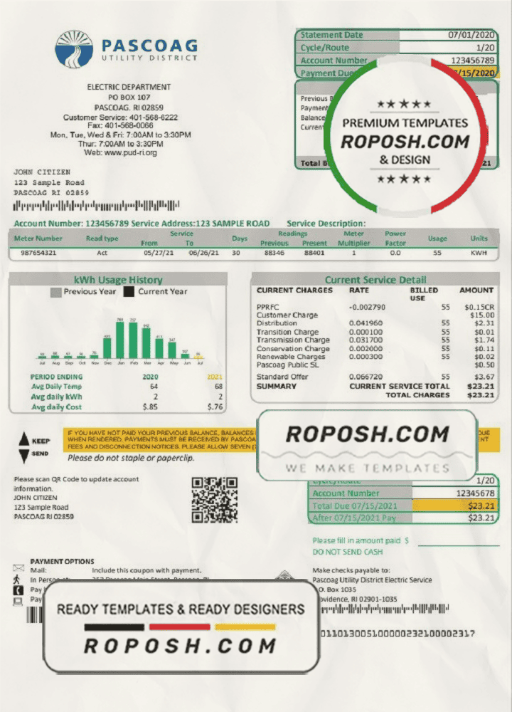 Get your blank USA Rhode Island Pascoag Utility District utility bill template from Roposh. Customize it with your information to create a editable utility bill for proof of address. Ideal for situations where your utility bill is expired, stolen, or unavailable. Explore our range of templates, including passport PSD templates, ID card PSD templates, bank statement PSD templates, driver’s license PSD templates, and more.