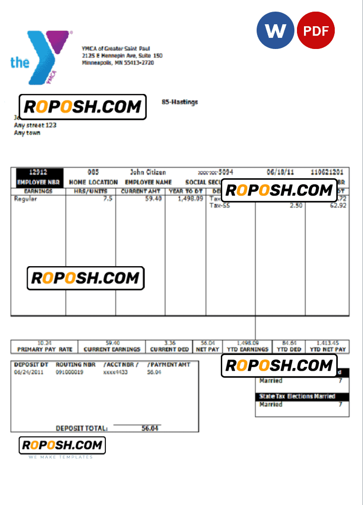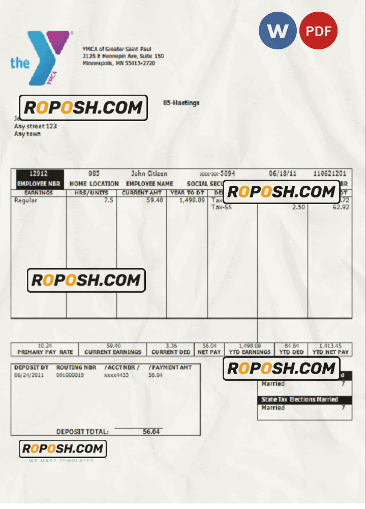 Grab now fully editable USA social service company employee sheet Template from our website roposh and put your own info to create a copy of USA social service company employee sheet template Word and ready your own novelty documents. It’ll be so beneficial if your pay stub is expired, stolen or not available. We also have word invoice template, ID Card psd template, Bank Statement psd template, drivers license psd template, Utility bill psd template & pay stub.