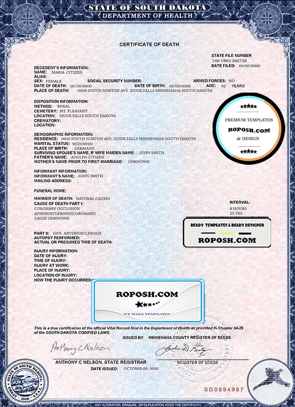 Authentic Editable USA South Dakota state Death Certificate Template :