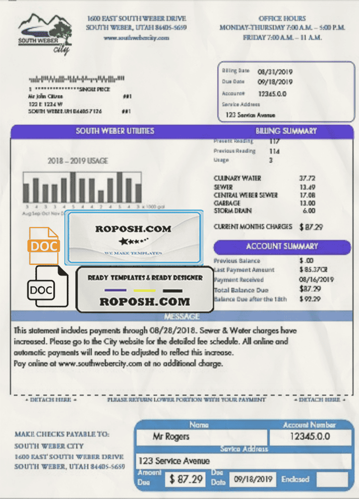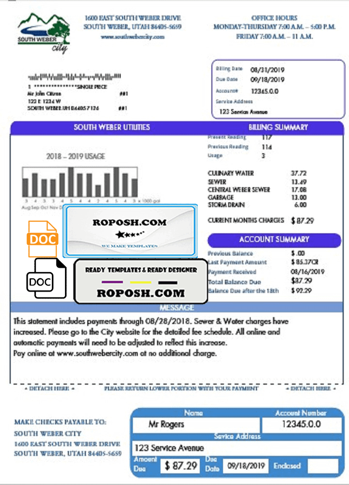 USA South Weber City Utah water utility bill template in Word and PDF format