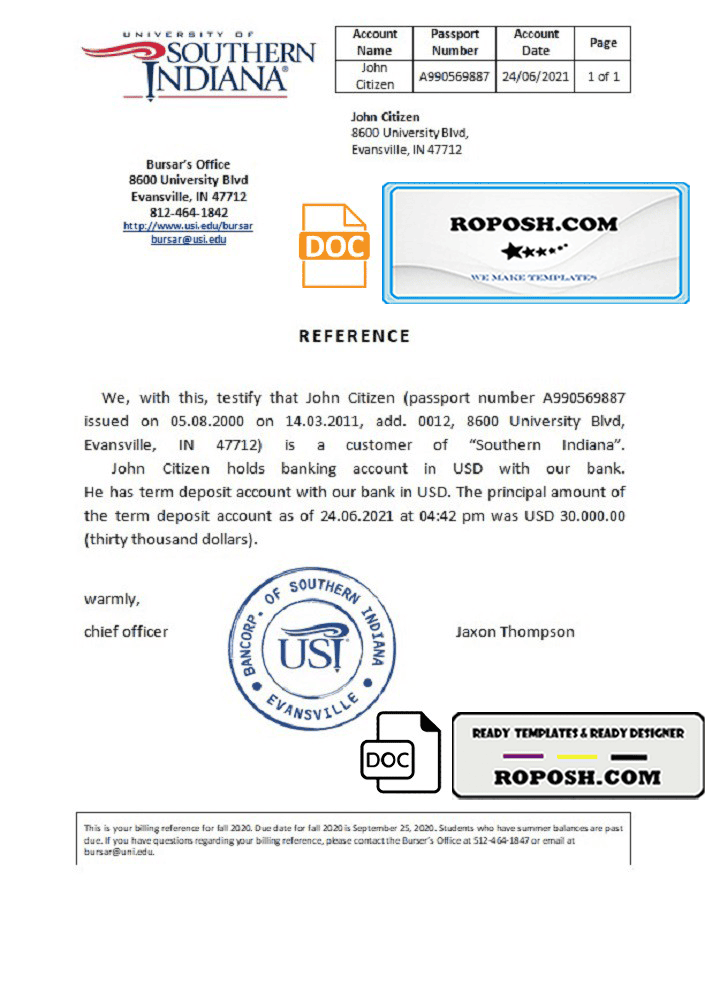 Be the first to review “USA Southern Indiana bank account reference letter template in Word and PDF format”
