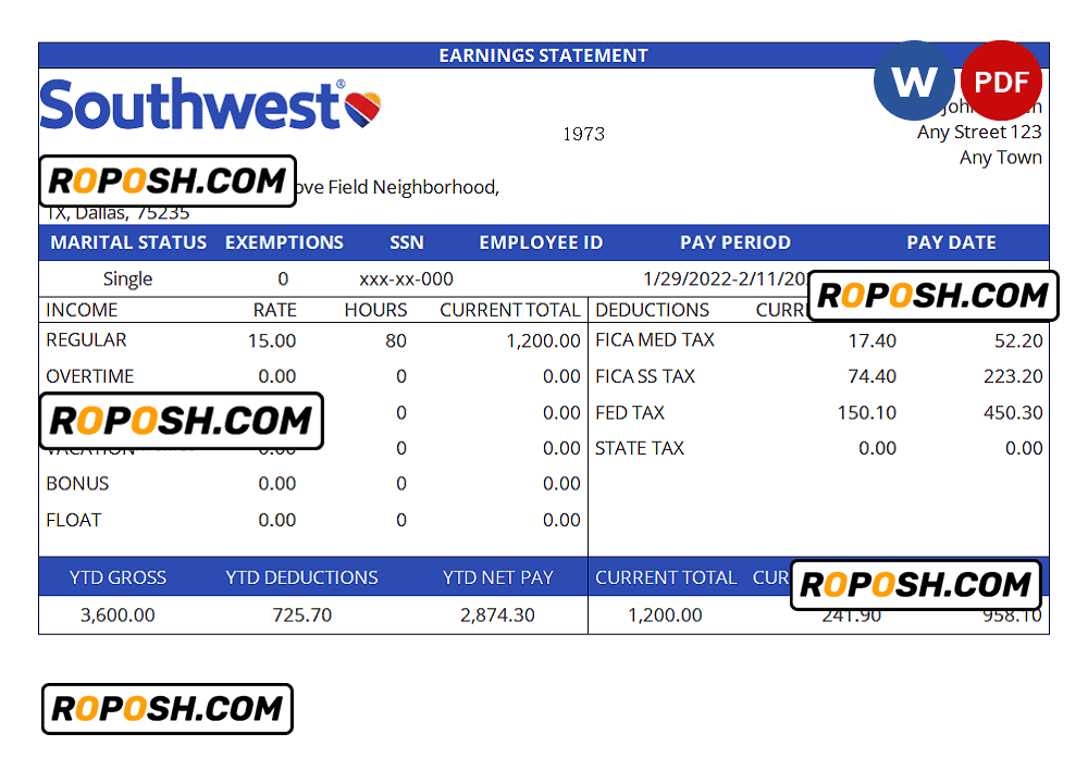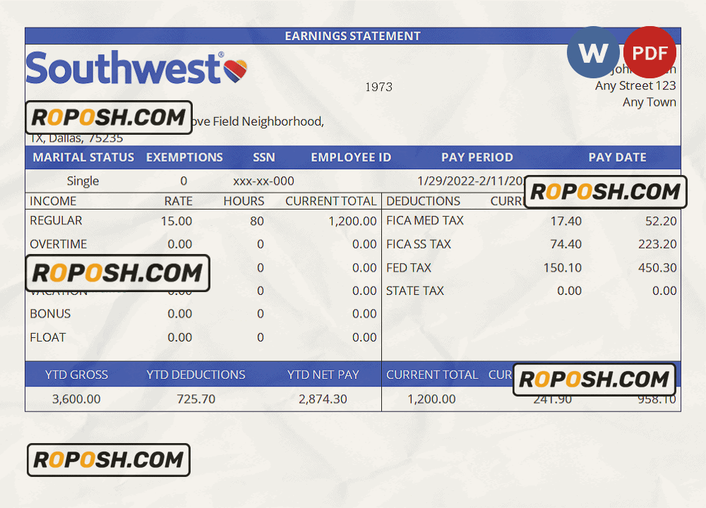 Grab now fully editable USA Southwest Airlines airlines company pay stub Template from our website roposh and put your own info to create a copy of USA Southwest Airlines airlines company pay stub template Word and ready your own novelty documents. It’ll be so beneficial if your pay stub is expired, stolen or not available. We also have word invoice template, ID Card psd template, Bank Statement psd template, drivers license psd template, Utility bill psd template & pay stub.
