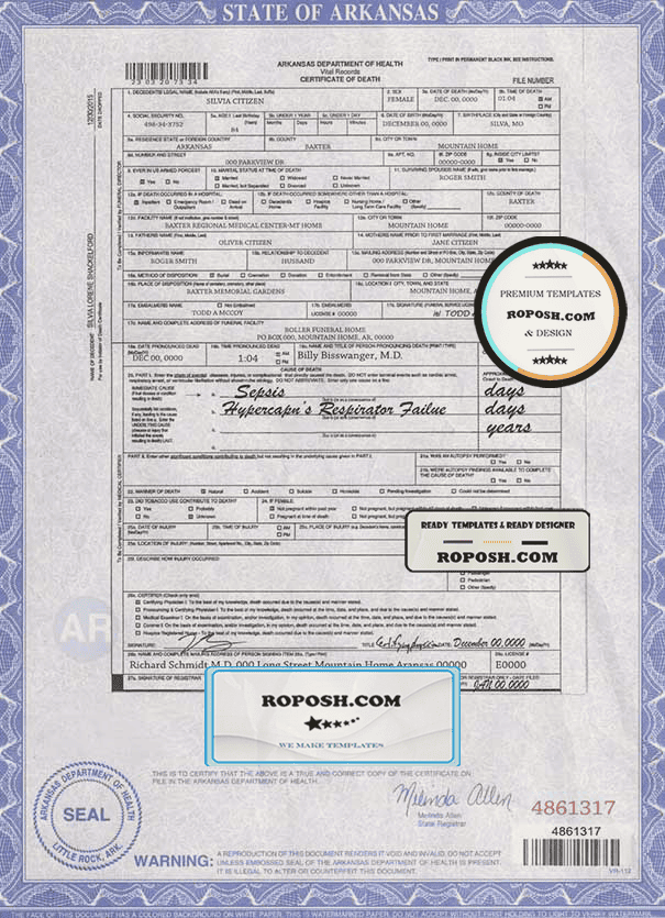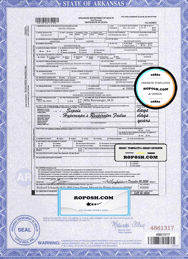 Authentic Editable USA state Arkansas Death Certificate Template :