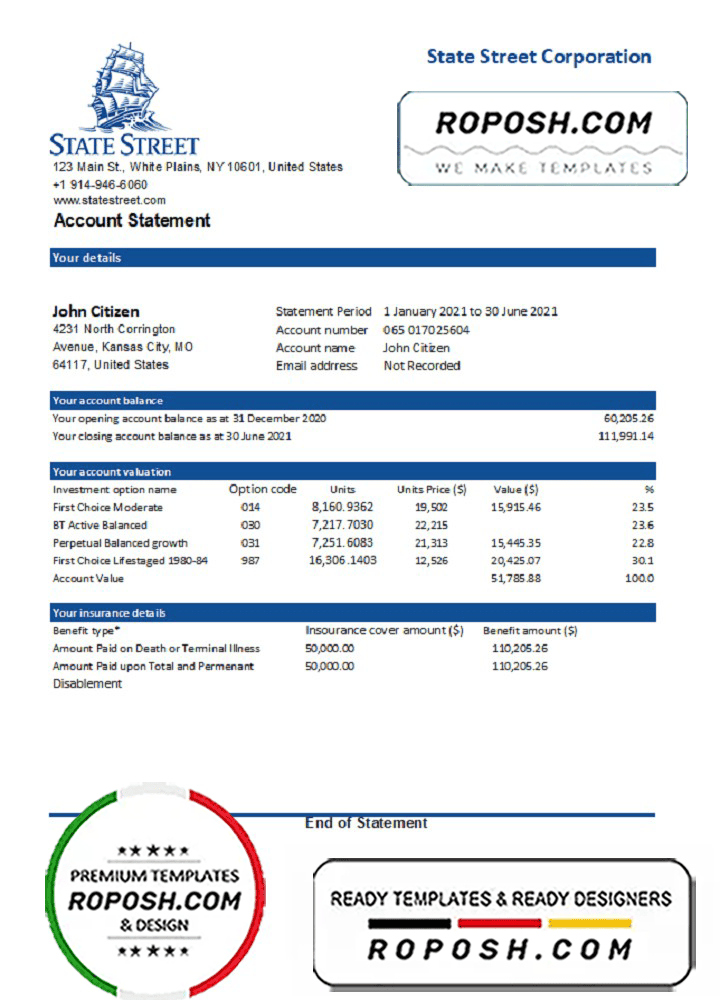Grab now fully editable USA State Street Corporation bank statement Excel Template from our website Roposh and put your own info to create Realistic Bank Statement template Excel and ready your own novelty documents. It’ll be so beneficial if your Bank Statement is expired, stolen or not available.We also have editable credit card, ID Card psd template, Bank Statement psd template, drivers license psd template & printable editable blank utility bill template.