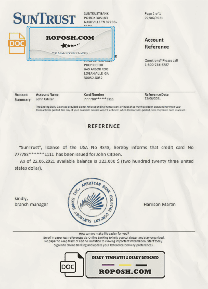 USA SunTrust bank account reference letter template in Word and PDF format offer high-quality customizable bank reference form template in PSD and Word format, allowing you to easily fill in your personal details and make them look authentic. Our templates are perfect for online account verification, research, presentation, or work.