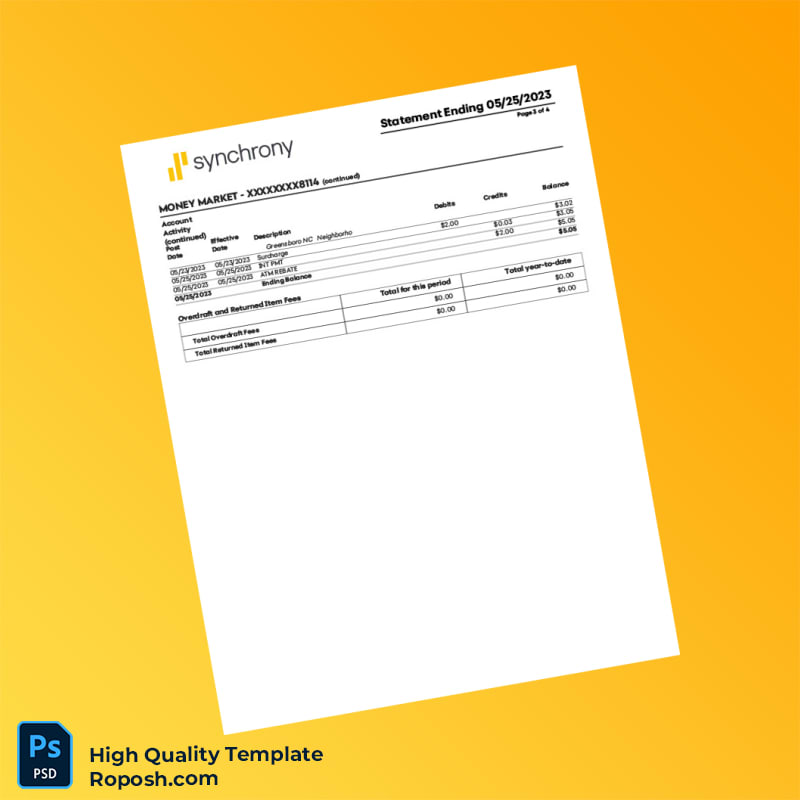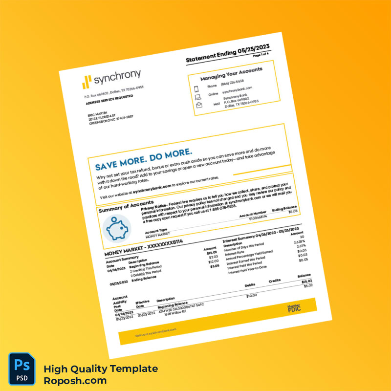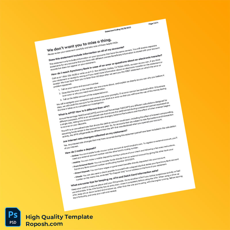 Forget the days of tedious document creation. Imagine a busy professional facing the pressure of a looming deadline because their bank statement is lost or overdue. With our USA Synchrony Bank Statement Template, they can swiftly retrieve the necessary details and customize the statement to their needs, allowing them to meet their commitments effortlessly. Browse our complete collection of bank statement templates for more options.