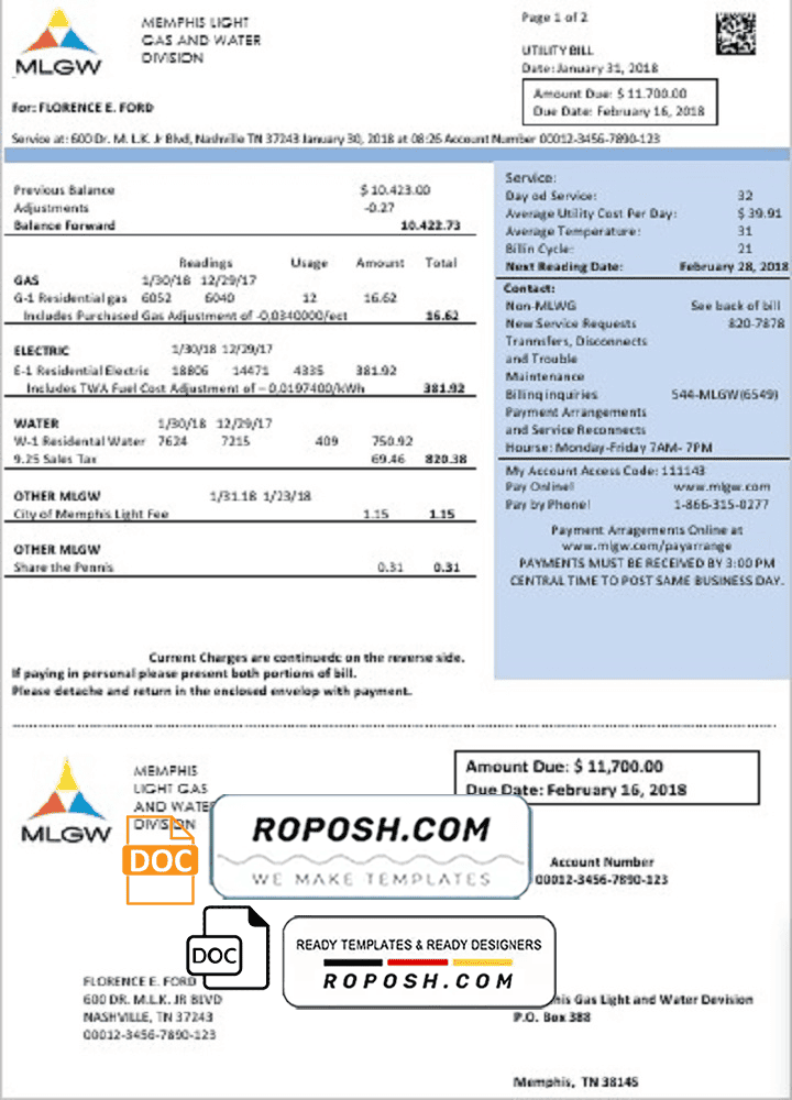 Get your hands on a blank USA Tennessee MLGW utility bill template from our website, Roposh. Customize it with your own information to create a convincing editable utility bill for proof of address. Ideal for situations where your utility bill is expired, lost, or unavailable. We also offer a variety of other templates, including passport PSD templates, ID card PSD templates, bank statement PSD templates, driver’s license PSD templates, and utility bill PSD templates.