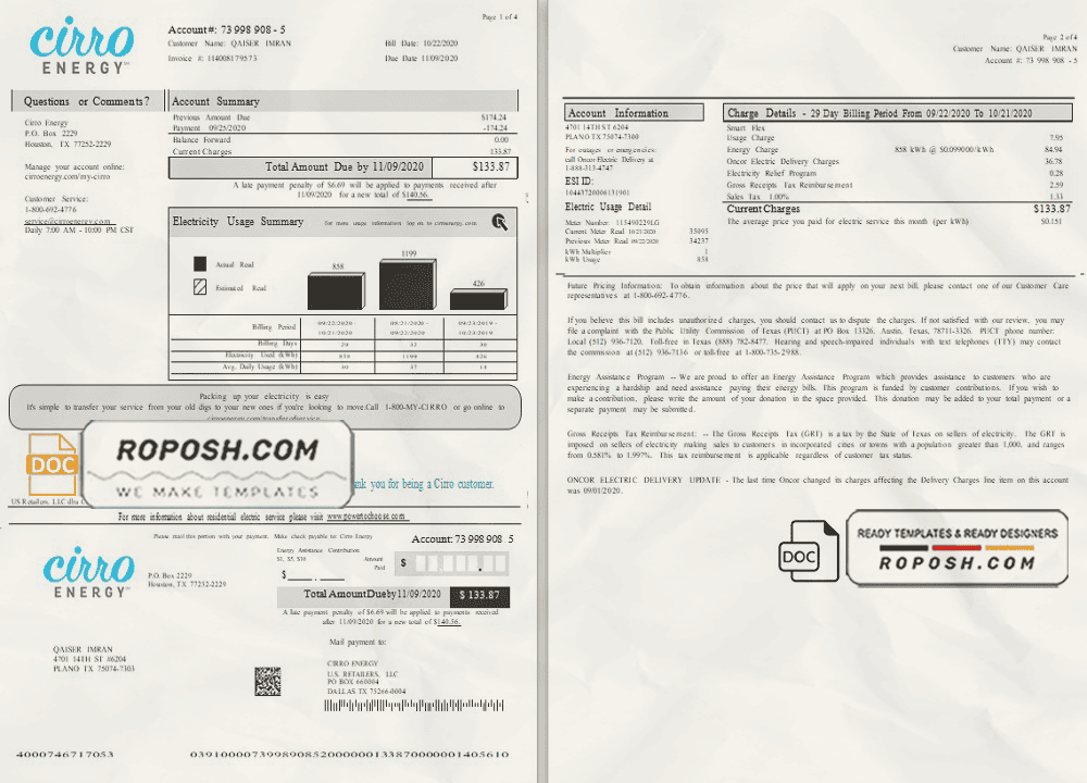 USA Texas Cirro Energy Utility Bill Template – Editable Word Format