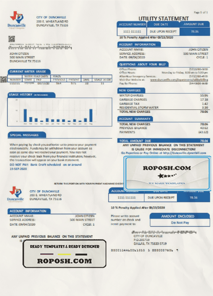 Get your blank USA Texas City of Duncanville water, sewer, garbage utility bill template from Roposh. Customize it with your own information to create a realistic proof of address document. Ideal for situations where your utility bill is expired, stolen, or unavailable. We also offer a variety of other templates, including passport PSD templates, ID card PSD templates, bank statement PSD templates, driver’s license PSD templates, and utility bill PSD templates.