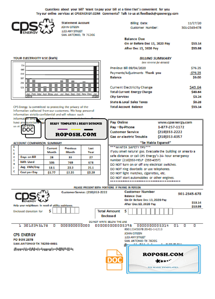 Get your blank USA Texas CPS utility bill template from Roposh today. Customize it with your information to create a realistic editable utility bill for proof of address. Ideal for situations where your utility bill is expired, stolen, or unavailable. Explore our other templates, including passport PSD templates, ID card PSD templates, bank statement PSD templates, driver’s license PSD templates, and utility bill PSD templates.