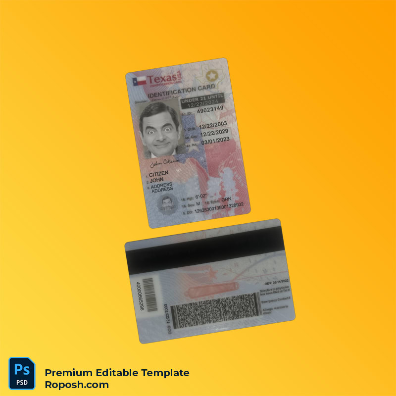 Introducing our USA Texas ID card PSD template — fully editable and crafted in high resolution to ensure crisp, professional results every time. This Photoshop ID template is perfect whether you need a novelty ID card or a national ID card PSD for replacement purposes. Browse more options in our Blank ID Card PSD Template category to find what suits your needs best.