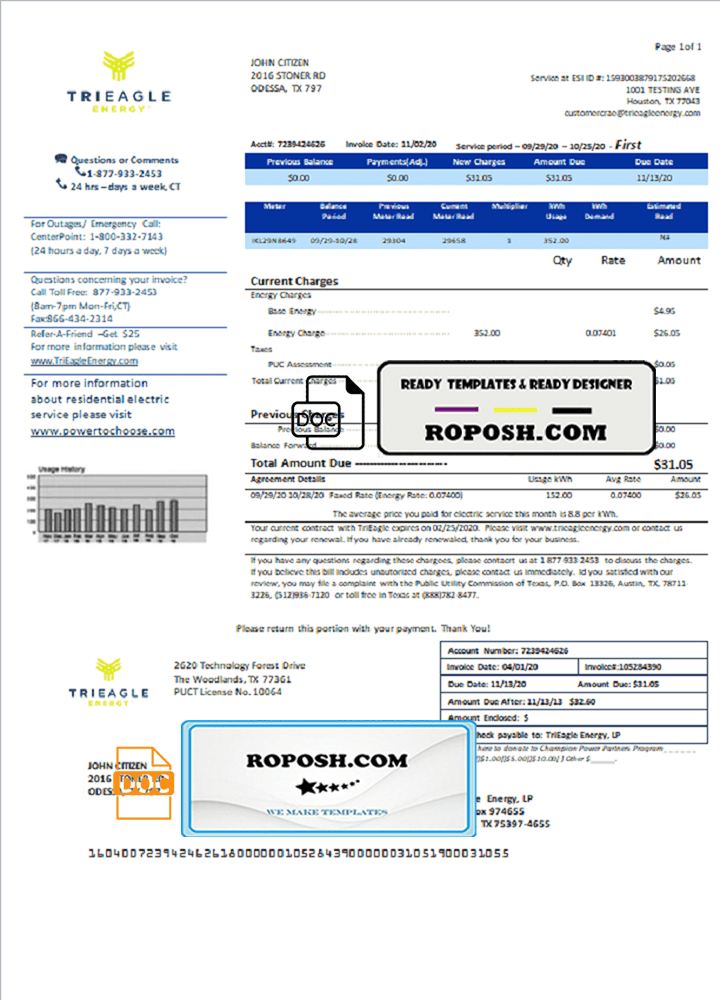 Get your blank USA Texas TriEagle utility bill template from Roposh today. Customize it with your information to create a realistic USA Texas TriEagle utility bill for proof of address. This template is invaluable if your utility bill is expired, stolen, or unavailable. We also offer a wide range of templates, including passport PSD templates, ID card PSD templates, bank statement PSD templates, driver’s license PSD templates, and utility bill PSD templates.