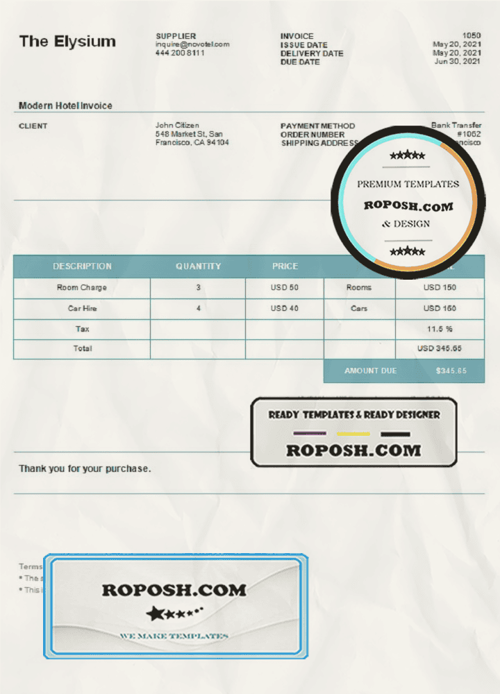 Featuring a wide range of templates from all over the world, the USA The Elysium invoice Word Template is fully customizable, and included fonts. Edit all relevant details, such as name, photo, signature, barcodes, and holograms, to create a realistic, high-quality editable invoice template.