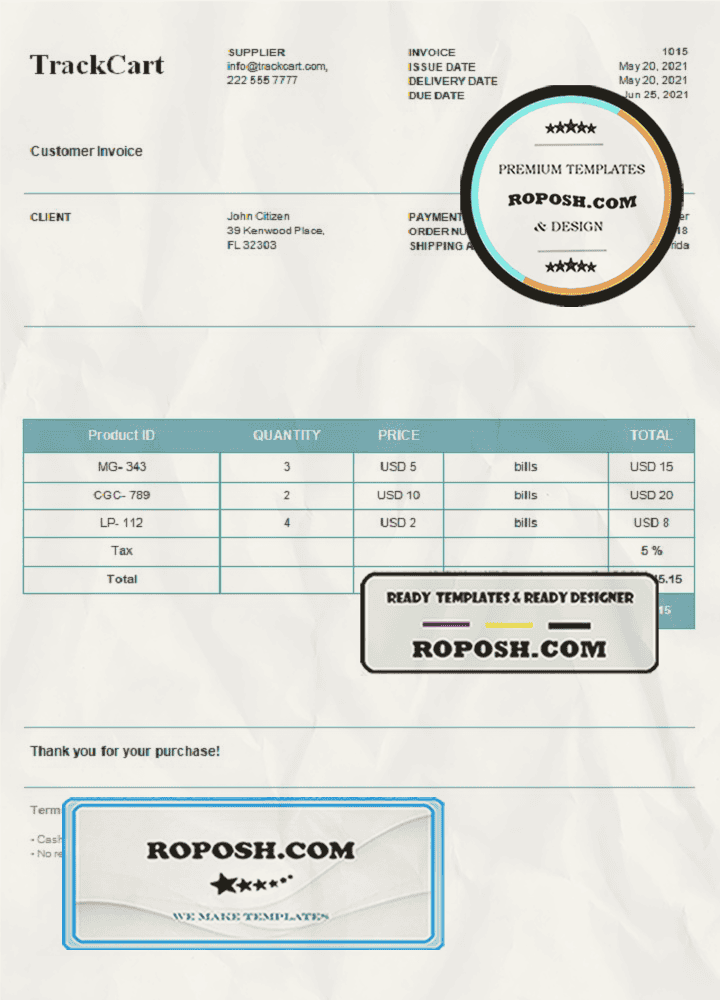 Featuring a wide range of templates from all over the world, the USA TrackCart invoice Word Template is fully customizable, and included fonts. Edit all relevant details, such as name, photo, signature, barcodes, and holograms, to create a realistic, high-quality editable invoice template.