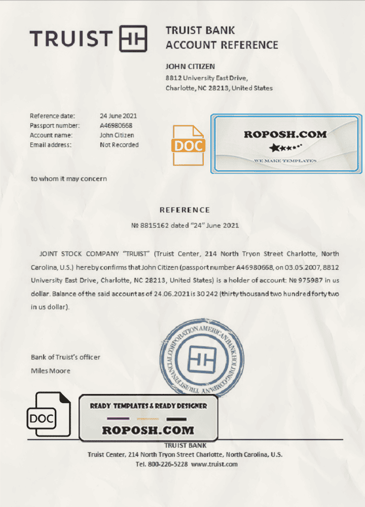 USA Truist Bank bank account balance reference letter template in Word and PDF format