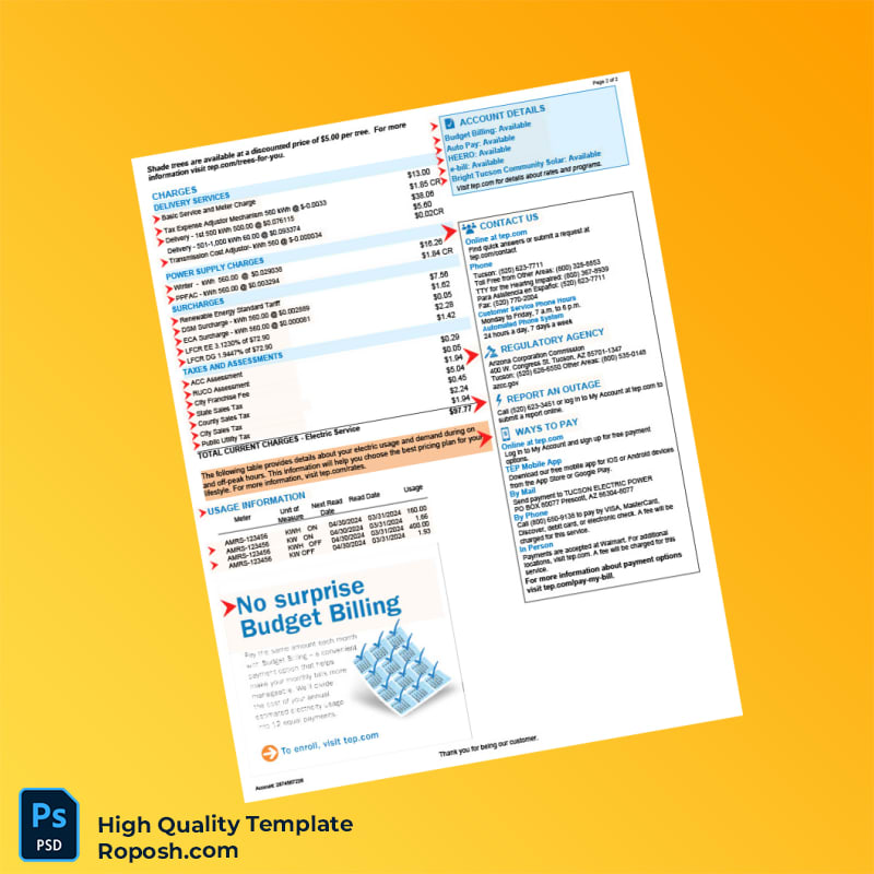 USA Tucson Electric Power Editable Electricity Bill Template in Word and PDF formats 2 page