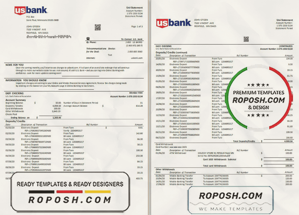 Get your fully editable USA U.S. Bank Statement Word Template from Roposh and customize it with your own information to create realistic novelty documents. This is especially useful if your bank statement is expired, stolen, or unavailable. We also offer editable credit card templates, ID card templates, bank statement PSD templates, driver’s license PSD templates, and printable editable blank utility bill templates.