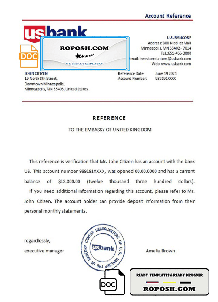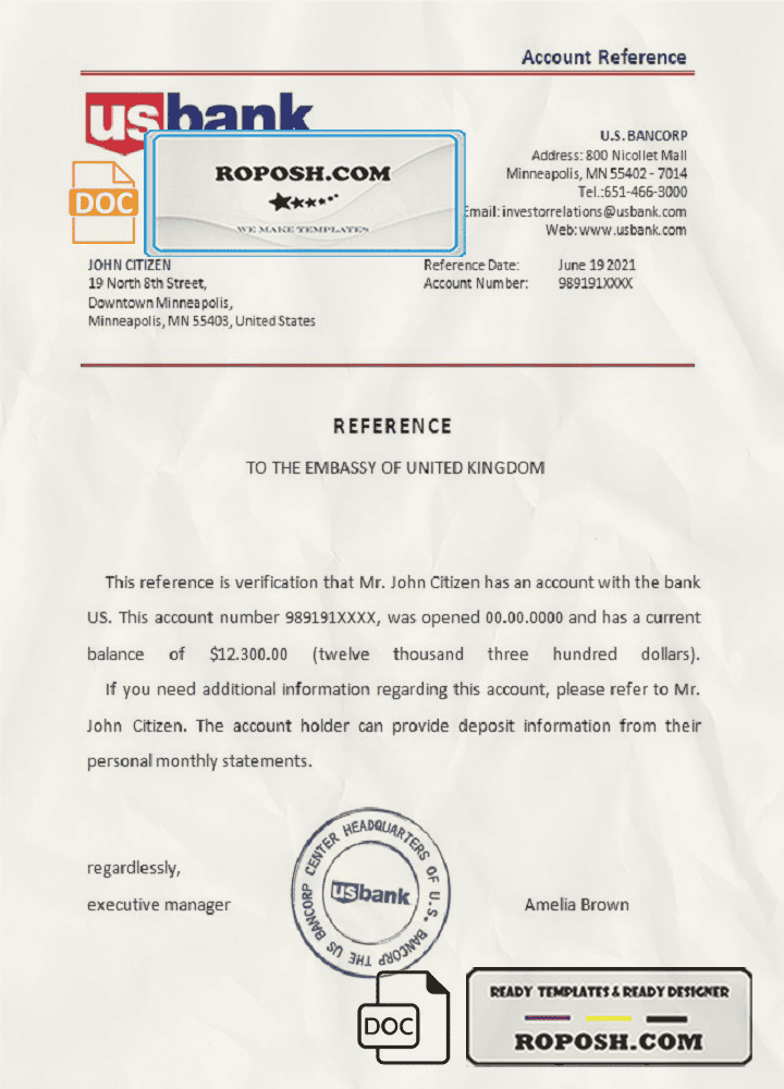 USA US Bank bank account reference letter template in Word and PDF format