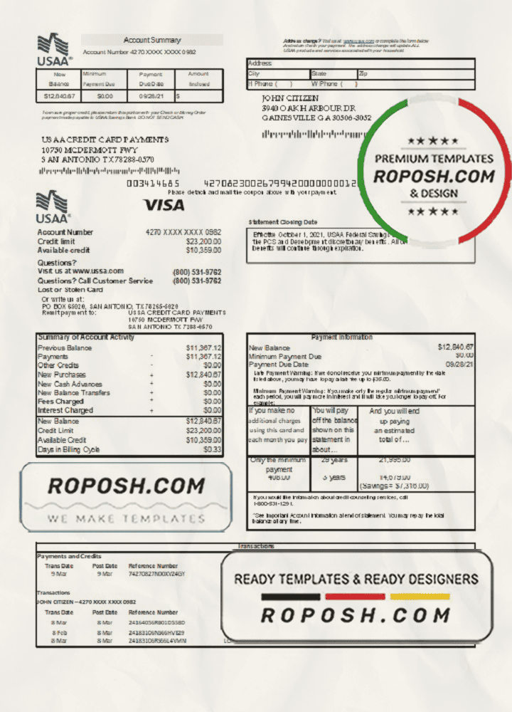Grab now fully editable USA USAA bank Credit card statement Excel Template from our website Roposh and put your own info to create Realistic Bank Statement template Excel and ready your own novelty documents. It’ll be so beneficial if your Bank Statement is expired, stolen or not available.We also have editable credit card, ID Card psd template, Bank Statement psd template, drivers license psd template & printable editable blank utility bill template.