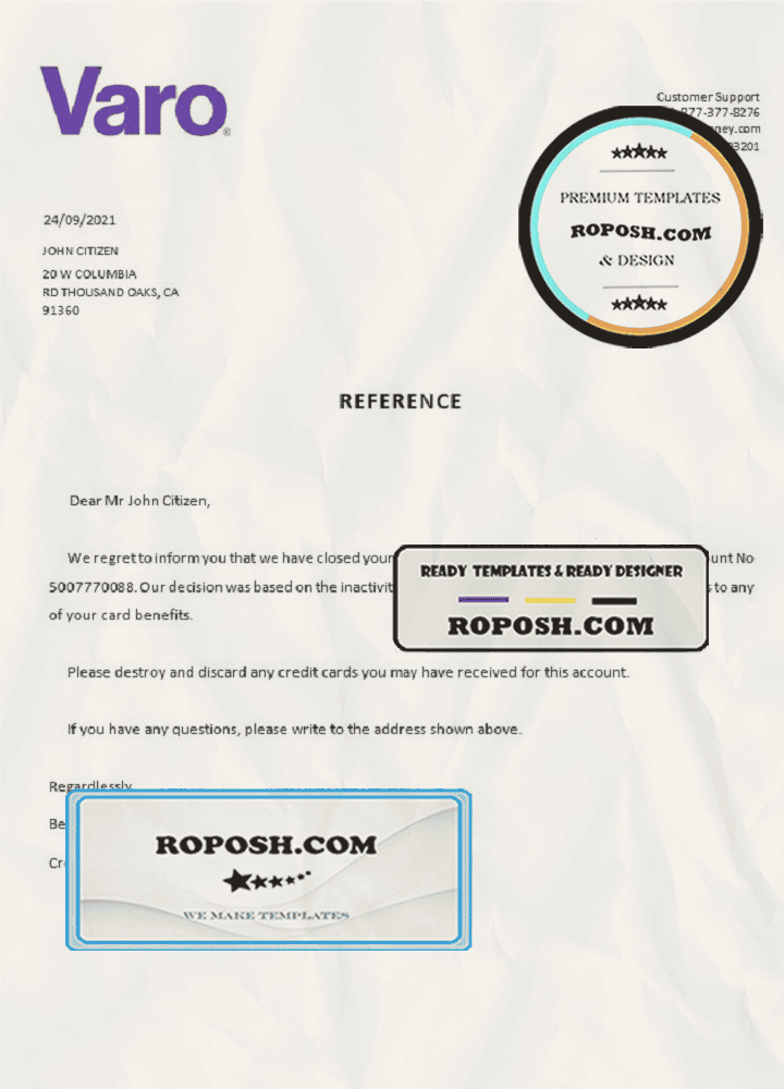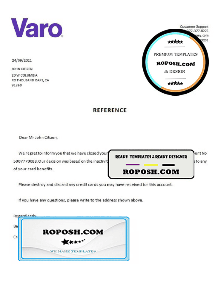 Be the first to review “USA Varo bank account closure reference letter template in Word and PDF format”