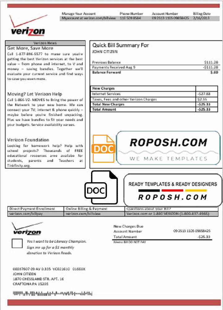 Get your blank USA Verizon utility bill template from Roposh today. Customize it with your information to create a realistic editable utility bill for proof of address. Ideal for situations where your utility bill is expired, stolen, or unavailable. We also offer a variety of other templates, including passport PSD templates, ID card PSD templates, bank statement PSD templates, driver’s license PSD templates, and utility bill PSD templates.