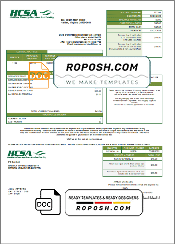 Get your blank USA Virginia HCSA utility bill template from Roposh today. Customize it with your own information to create a realistic editable utility bill for proof of address. Ideal for situations where your utility bill is expired, stolen, or unavailable. Explore our range of templates, including passport PSD templates, ID card PSD templates, bank statement PSD templates, driver’s license PSD templates, and more.