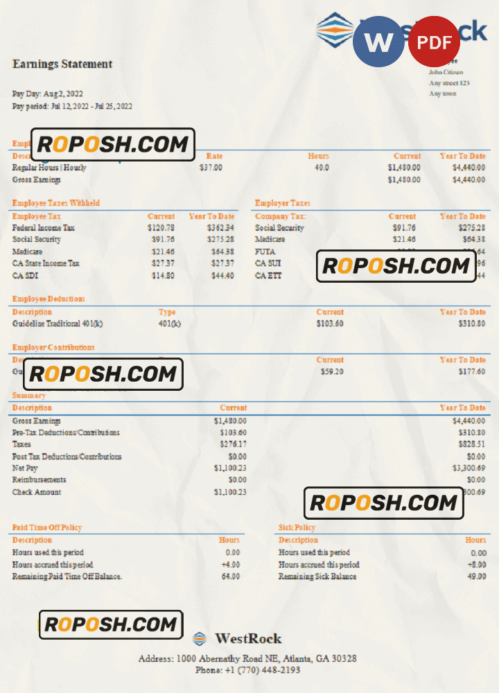 Grab now fully editable USA WestRock packaging company pay stub Template from our website roposh and put your own info to create a copy of USA WestRock packaging company pay stub template Word and ready your own novelty documents. It’ll be so beneficial if your pay stub is expired, stolen or not available. We also have word invoice template, ID Card psd template, Bank Statement psd template, drivers license psd template, Utility bill psd template & pay stub.