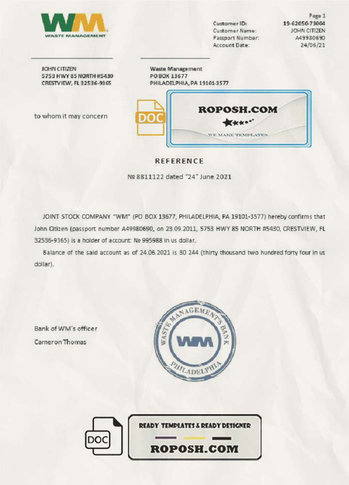 USA WM bank account reference letter template in Word and PDF format