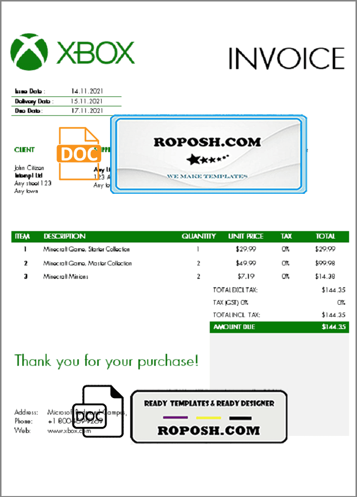 Featuring a wide range of templates from all over the world, the USA Xbox invoice Word Template is fully customizable, and included fonts. Edit all relevant details, such as name, photo, signature, barcodes, and holograms, to create a realistic, high-quality editable invoice template.