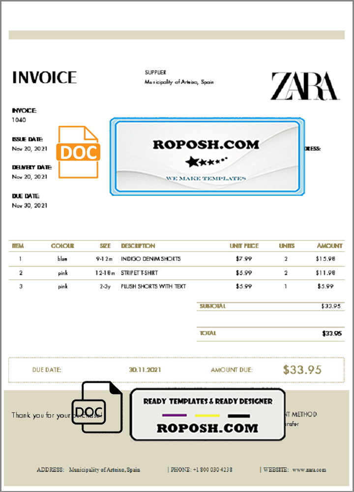 USA ZARA invoice template in Word and PDF (.doc and .pdf) format