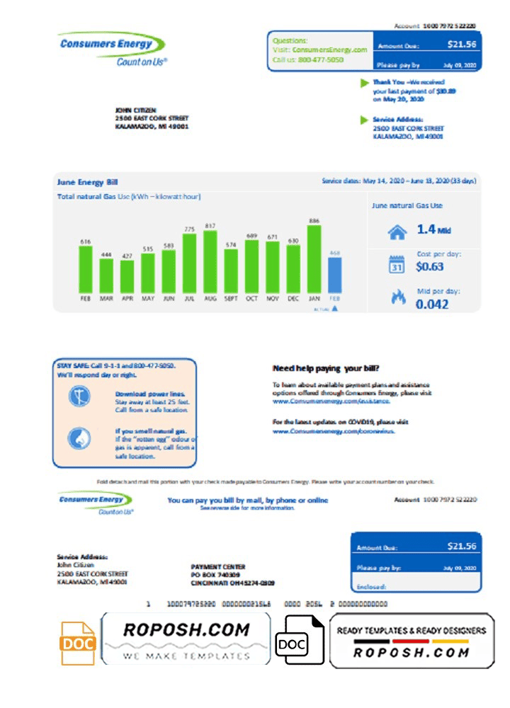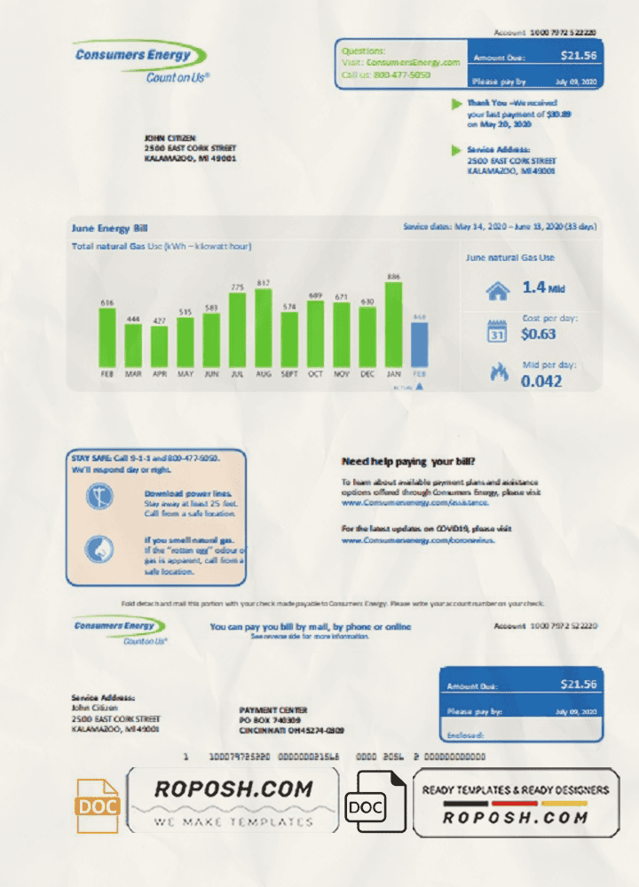 Get your blank USA Michigan Consumers Energy utility bill template from Roposh today. Customize it with your own information to create a copy for proof of address. Ideal for situations where your utility bill is expired, stolen, or unavailable. We also offer a variety of other templates, including passport PSD templates, ID card PSD templates, bank statement PSD templates, driver’s license PSD templates, and utility bill PSD templates.