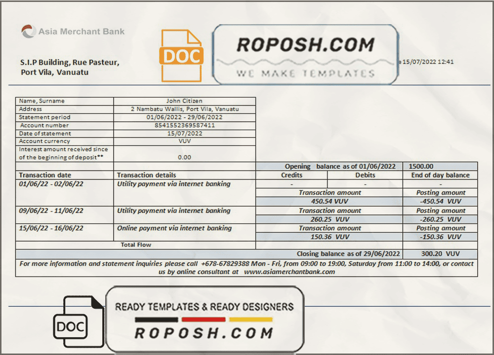 Get your fully editable Vanuatu Asia Merchant Bank Statement Word Template from Roposh and customize it with your information to create realistic bank statements. This is beneficial if your bank statement is expired, stolen, or unavailable. We also offer editable credit card templates, ID card PSD templates, bank statement PSD templates, driver’s license PSD templates, and printable editable blank utility bill templates.
