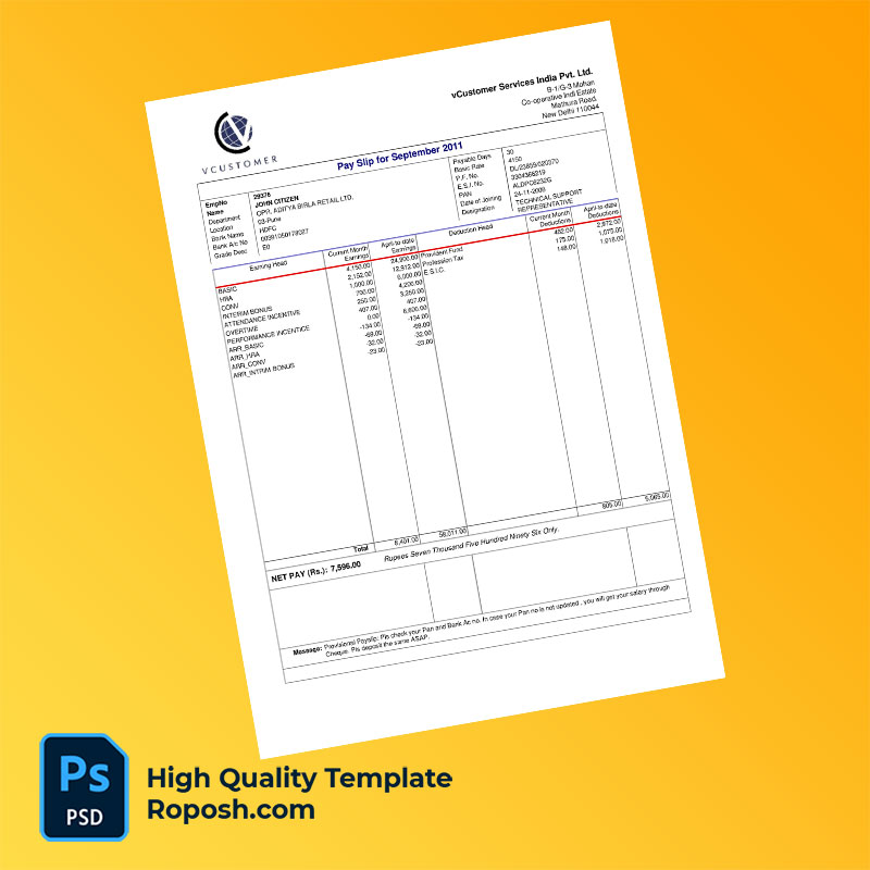 vCustomer Services India Pvt Ltd payslip word and pdf template