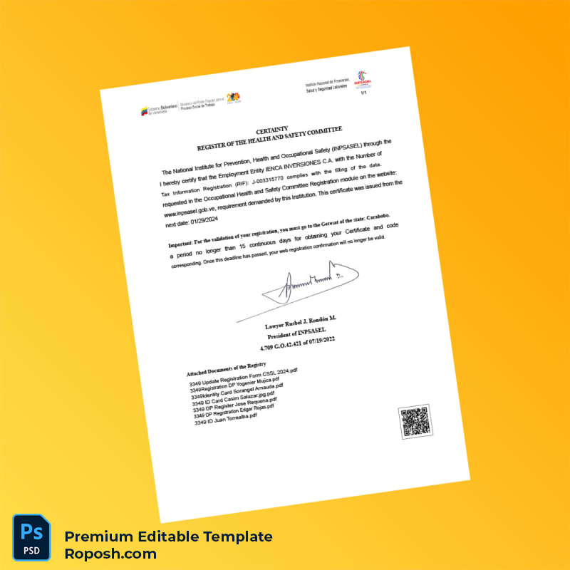 Venezuela INPSASEL Registration Certificate Editable Word & PDF Template