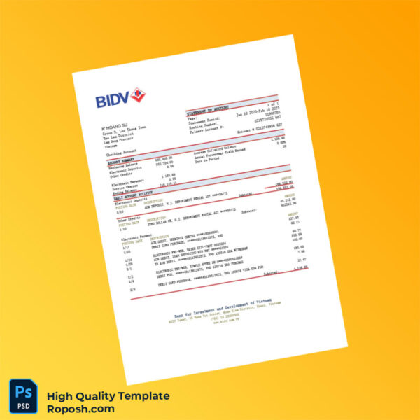 Imagine the stress of suddenly needing a bank statement for an urgent application, only to realize your original document is lost or outdated. With the editable bank statement template from Roposh, you can take control of your situation effortlessly. Our Vietnam BIDV Bank Statement Template empowers you to fill out necessary details in a matter of minutes, saving you precious time.