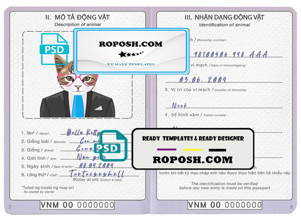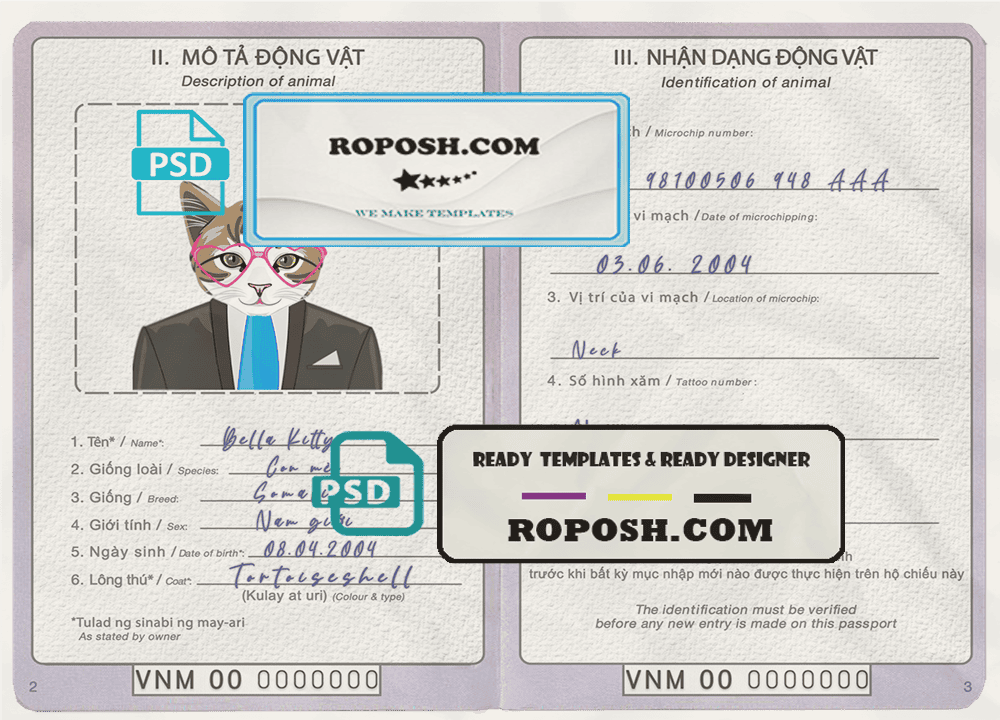 Vietnam cat (animal, pet) passport PSD template, is designed to look and feel like real documents. Each template is carefully crafted to include all the necessary details, such as your pet’s name, breed, date of birth, and microchip information. With our fillable cat or dog passport templates, you can quickly and easily create a editable pet passport that meets all the requirements for international travel.