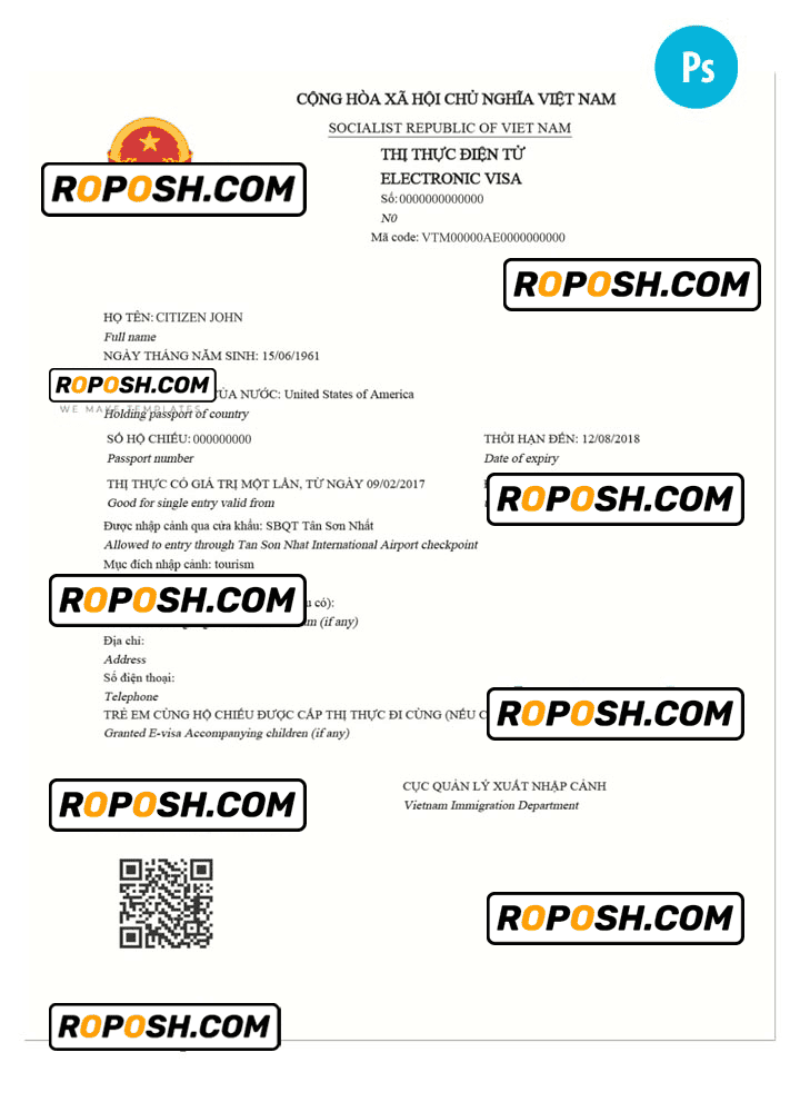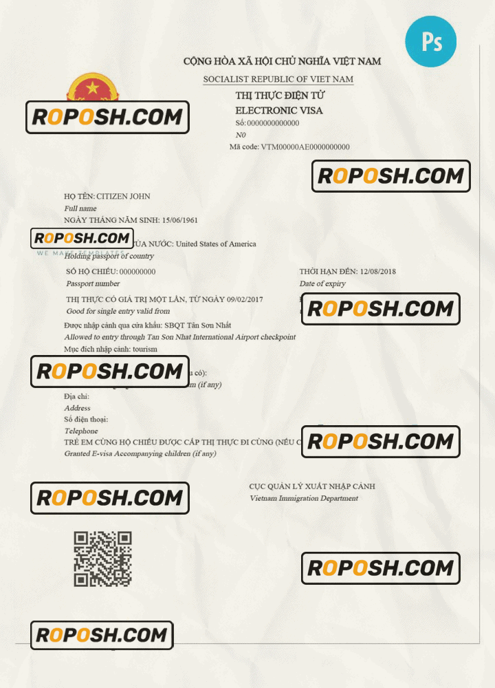 VIETNAM electronic travel visa template psd. Buy Customizable Travel Visa Template with high quality and enjoy its unique features such as easy to customize, Layer based, fonts included sample. you can edit this template and put any name, address, license number, Id number, birth date, height, weight, expire date, change photos etc. This Photoshop template is a layer based psd file and it’s easy to Editing.To modify this photoshop template file you will need a Photo editing software such as Adobe Photoshop No need to be expert on editing software like adobe Photoshop. However, You just have to basic knowledge on adobe photoshop, to edit this template. Never used low quality template. Your account may be suspended. Also, if you’re looking for an editable SSN template, Roposh is by your side so you can get it easily and even for free.