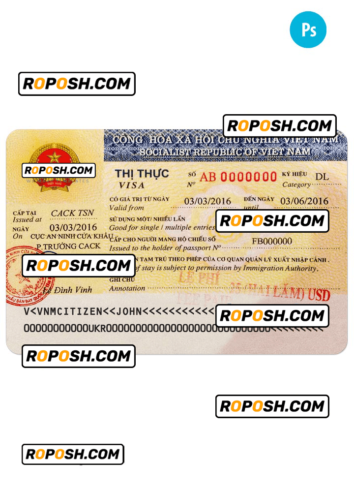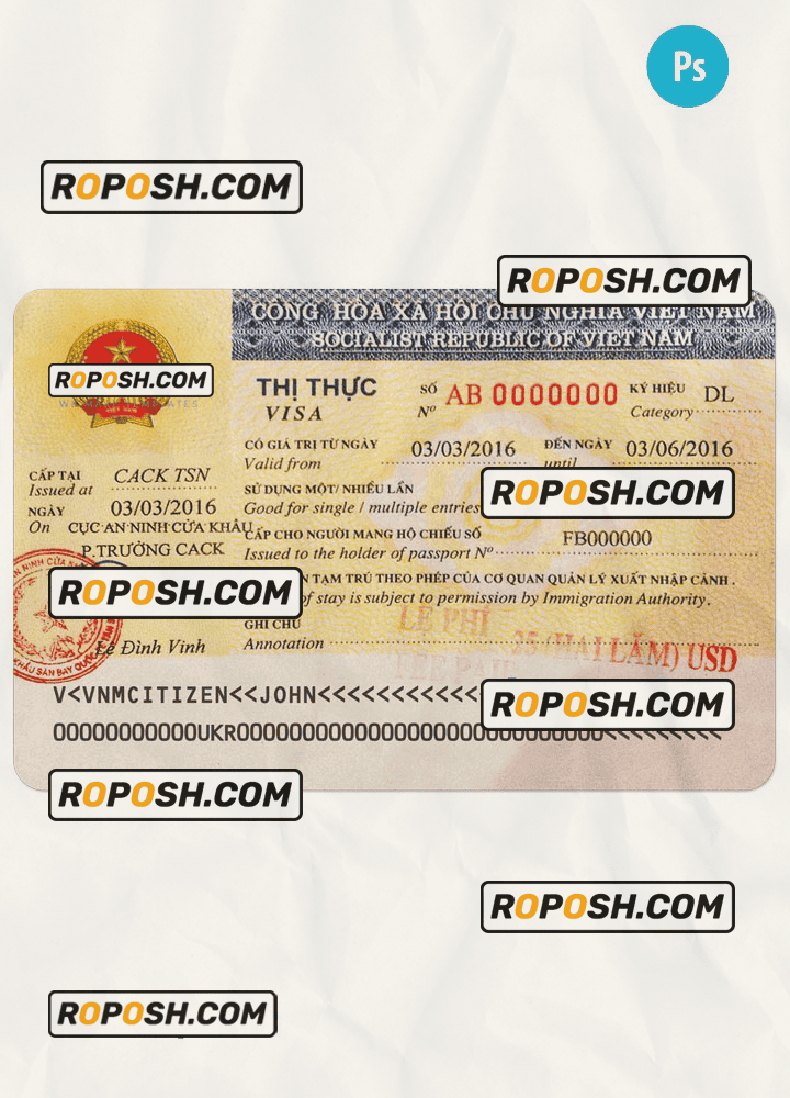 VIETNAM entry visa template psd. Buy Customizable Travel Visa Template with high quality and enjoy its unique features such as easy to customize, Layer based, fonts included sample. you can edit this template and put any name, address, license number, Id number, birth date, height, weight, expire date, change photos etc. This Photoshop template is a layer based psd file and it’s easy to Editing.To modify this photoshop template file you will need a Photo editing software such as Adobe Photoshop No need to be expert on editing software like adobe Photoshop. However, You just have to basic knowledge on adobe photoshop, to edit this template. Never used low quality template. Your account may be suspended. Also, if you’re looking for an editable SSN template, Roposh is by your side so you can get it easily and even for free.