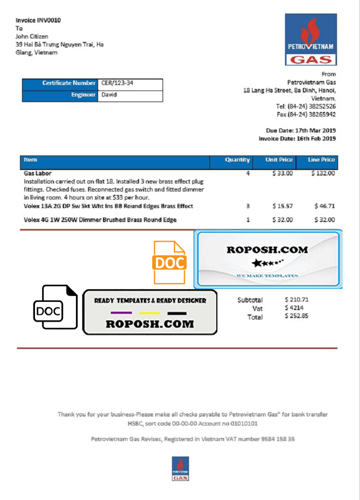 Vietnam Petrovietnam Gas Utility Bill Template – Editable Word Format