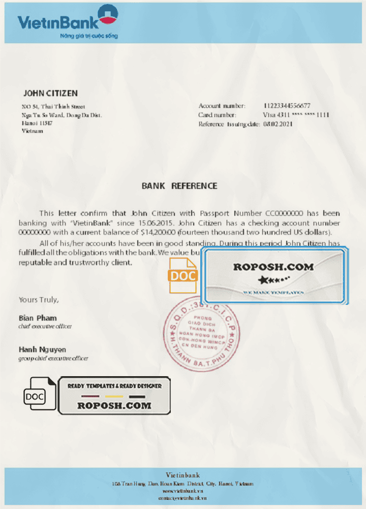 Vietnam Vietinbank bank reference letter template in Word and PDF format