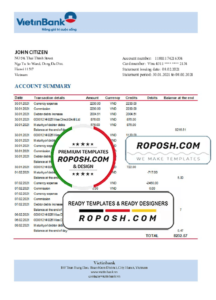 Grab now fully editable Vietnam Vietinbank bank statement Excel Template from our website Roposh and put your own info to create Realistic Bank Statement template Excel and ready your own novelty documents. It’ll be so beneficial if your Bank Statement is expired, stolen or not available.We also have editable credit card, ID Card psd template, Bank Statement psd template, drivers license psd template & printable editable blank utility bill template.