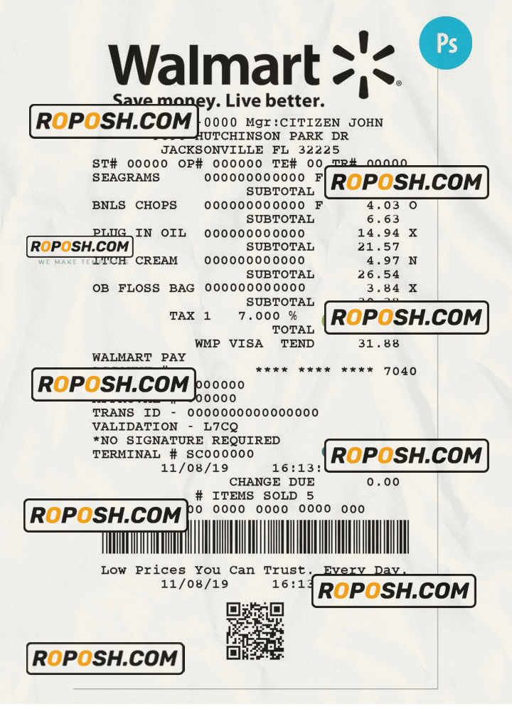Features Editable WALMART Receipt PSD Template :