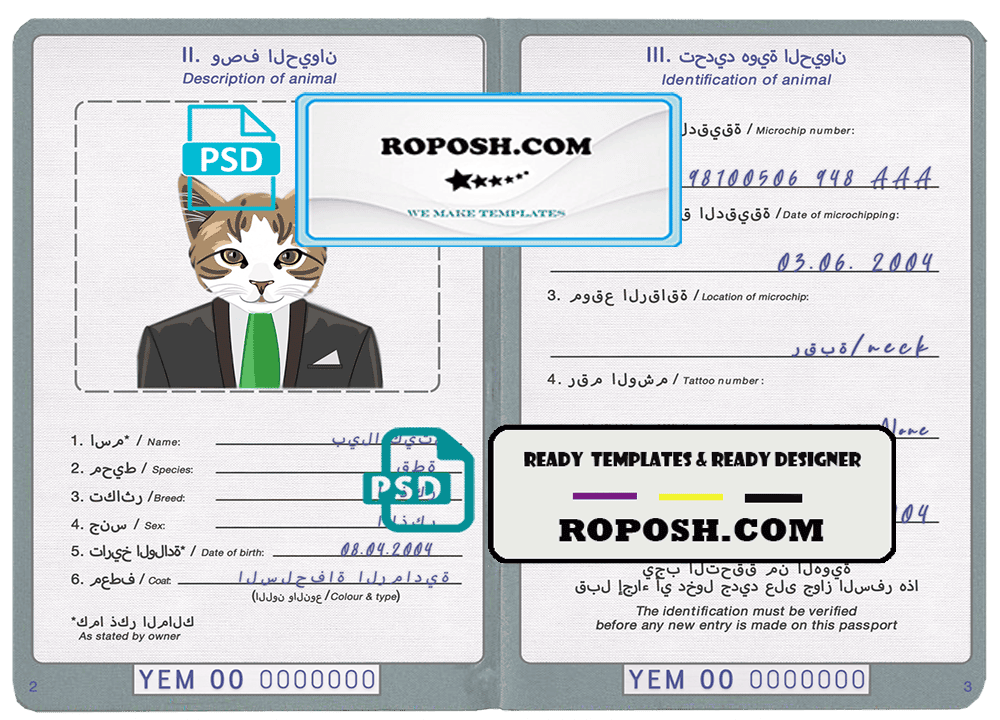 Yemen cat (animal, pet) passport PSD template, is your one-stop-shop for realistic and editable editable pet identity cards and passports. We specialize in creating high-quality, customizable editable pet passports and identity cards for dogs, cats, and other furry friends.