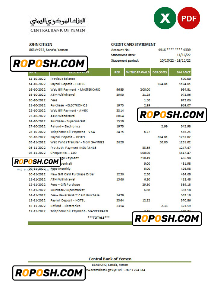 Get your fully editable Yemen Central Bank Statement Excel Template from Roposh and customize it with your own information to create a realistic bank statement. This is especially useful if your bank statement is expired, stolen, or unavailable. We also offer editable credit card templates, ID card templates, bank statement PSD templates, driver’s license PSD templates, and printable editable blank utility bill templates.
