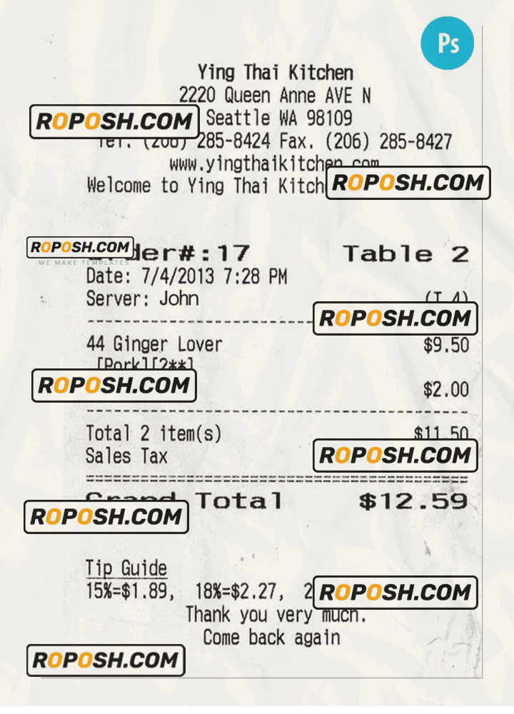 Features Editable YING THAI KITCHEN Receipt PSD Template :