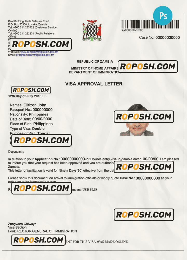 ZAMBIA electronic travel visa template psd. Buy Customizable Travel Visa Template with high quality and enjoy its unique features such as easy to customize, Layer based, fonts included sample. you can edit this template and put any name, address, license number, Id number, birth date, height, weight, expire date, change photos etc. This Photoshop template is a layer based psd file and it’s easy to Editing.To modify this photoshop template file you will need a Photo editing software such as Adobe Photoshop No need to be expert on editing software like adobe Photoshop. However, You just have to basic knowledge on adobe photoshop, to edit this template. Never used low quality template. Your account may be suspended. Also, if you’re looking for an editable SSN template, Roposh is by your side so you can get it easily and even for free.