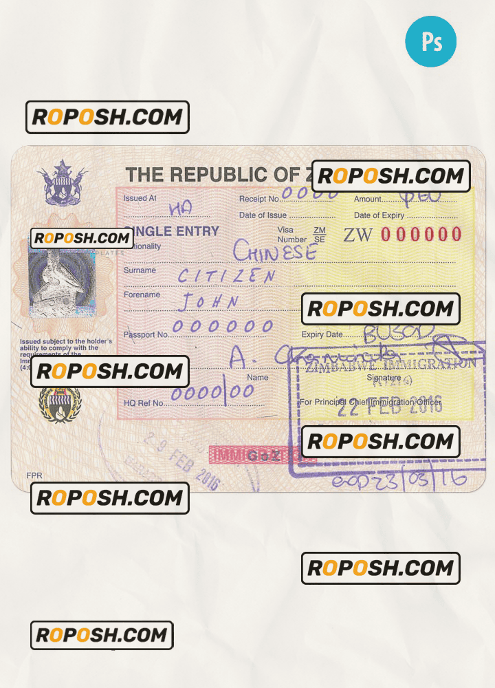 ZIMBABWE entry visa template psd. Buy Customizable Travel Visa Template with high quality and enjoy its unique features such as easy to customize, Layer based, fonts included sample. you can edit this template and put any name, address, license number, Id number, birth date, height, weight, expire date, change photos etc. This Photoshop template is a layer based psd file and it’s easy to Editing.To modify this photoshop template file you will need a Photo editing software such as Adobe Photoshop No need to be expert on editing software like adobe Photoshop. However, You just have to basic knowledge on adobe photoshop, to edit this template. Never used low quality template. Your account may be suspended. Also, if you’re looking for an editable SSN template, Roposh is by your side so you can get it easily and even for free.