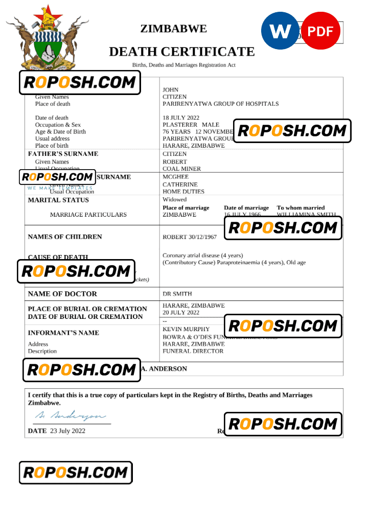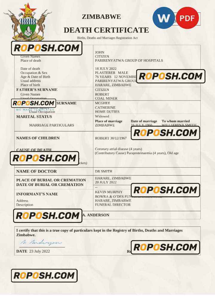 Explore a vast collection of legitimate-looking editable death certificates for several countries worldwide. The editable Zimbabwe death certificates offers easy access to obtaining the required document for a variety of purposes, predominantly claiming life insurance, pensions, and resolving estates.